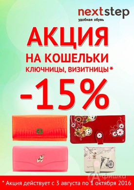 В салоне обуви и аксессуаров «Next Step» в Белгороде с 3 августа по 1 октября 2016 г. акция – скидка 15% на кошельки, ключницы, визитницы!