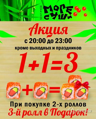 В ресторане «Море Суши» в Белгороде до 31 августа 2016 г. проходит акция «Дарим роллы»! С 20:00 до 23:00 (кроме выходных и праздников) при покупке 2-х роллов 3-й ролл в подарок!