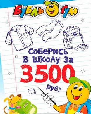 В гипермаркетах детских товаров «Бубль Гум» в Белгороде с 1 августа по 15 сентября 2016 г. проходит акция «Соберись в школу за 3500 руб.»! Ранец, рубашка, брюки и туфли – всё вместе всего за 3500 руб.!
