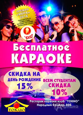 В ресторане караоке-клубе «Токио» в Белгороде проходит акция – весь август караоке бесплатно! А также действуют специальные предложения: скидка 15% на День рождения* и скидка 10% всем студентам!