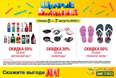 В «METRO Cash & Carry» в Белгороде каждую неделю проходит акция «Щедрые выходные»! Только с 5 по 7 августа 2016 г. скидка 50% на всю автокосметику, скидка 30% на все сковороды, скидка 50% на всю пляжную обувь!