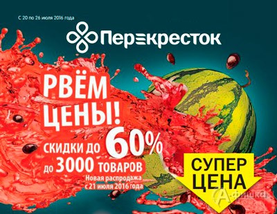 В супермаркетах «Перекрёсток» в Белгороде до 26 июля 2016 г. проходит акция «Рвём цены!» – на 3000 товаров скидки до 60%!