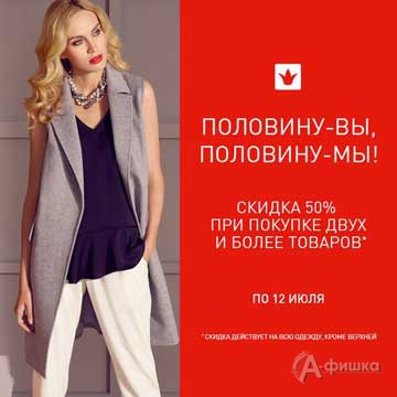 До 12 июля 2016 г. в магазине «Снежная Королева» в Белгороде действует специальное предложение – скидка 50% при покупке 2-х и более вещей!