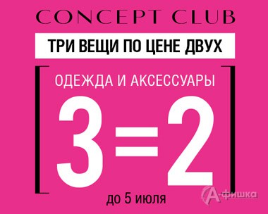 В магазине женской одежды «Concept Сlub» в Белгороде до 5 июля 2016 г. продлится акция «Три вещи по цене двух»! Предложение распространяется на одежду и аксессуары из новой коллекции.
