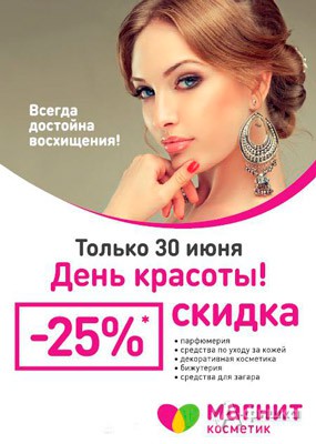 Только 30 июня 2016 г. в сети магазинов «Магнит Косметик» пройдёт акция «День красоты». Скидка 25% на парфюмерию, средства по уходу за кожей, декоративную косметику, бижутерию, средства для загара!