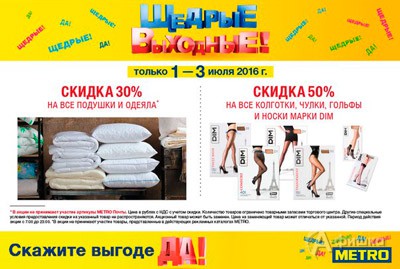 В «METRO Cash & Carry» в Белгороде каждую неделю проходит акция «Щедрые выходные»! Только с 1 по 3 июля 2016 г. скидка 30% на все подушки и одеяла, скидка 50% на все колготки, чулки, гольфы и носки марки «DIM»!