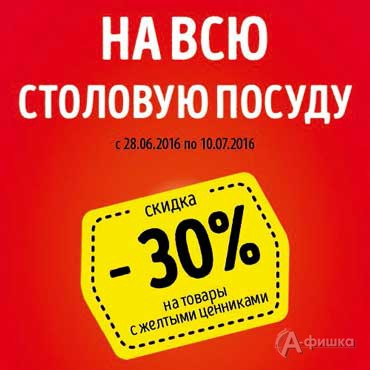 До 10 июля 2016 г. в магазине товаров для дома «Посуда Центр» действует скидка 30% на всю столовую посуду – тарелки, салатники, сервизы, чашки, блюдца, стаканы, бокалы и рюмки!