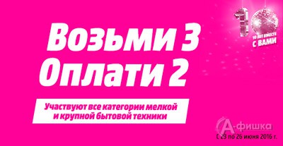 В магазине бытовой техники и электроники «Media Markt» до 26 июня 2016 г. проходит акция «Возьми 3, оплати 2» – при покупке 3-х различных товаров мелкой или крупной бытовой техники наименьший по стоимости товар Вы получите бесплатно!