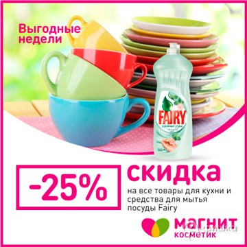В сети магазинов «Магнит Косметик» проходит акция «Выгодные недели». С 25 по 30 июня 2016 г. скидка 25% на все товары для кухни и средства для мытья посуды «Fairy»!