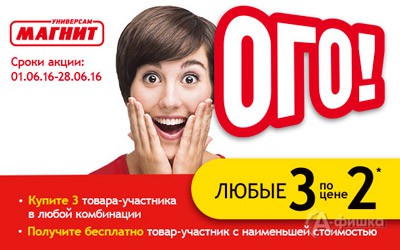 До 28 июня 2016 г. в универсамах «Магнит» проходит акция «Ого! Любые 3 по цене 2-х» на товары для красоты и здоровья! Купите 3 товара-участника в любой комбинации и получите бесплатно товар с наименьшей стоимостью!