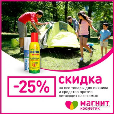 В сети магазинов «Магнит Косметик» проходит акция «Выгодные недели». С 8 по 14 июня 2016 г. скидка 25% на все товары для пикника и средства против летающих насекомых!