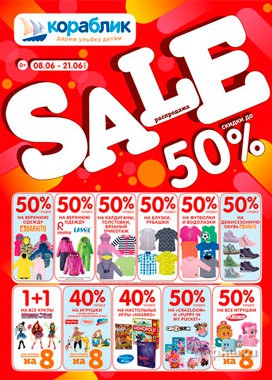 С 8 по 21 июня 2016 г. в детских магазинах «Кораблик» большая распродажа – действуют скидки до 50% на одежду, обувь и игрушки; скидки до 30% на сезонные товары!