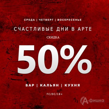 Каждую среду, четверг и воскресенье в Арт-клубе «Студия» проходит акция «Счастливые дни в Арте»! Действует скидка 50% на бар, кухню и кальяны.