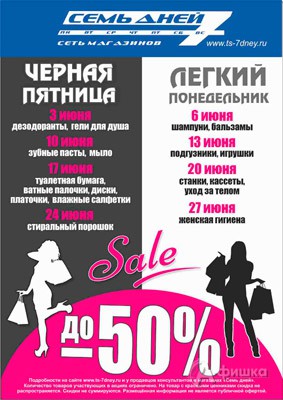 В июне 2016 г. в сети магазинов парфюмерии, косметики и бытовой химии «7 дней» в Белгороде проходит акция «Чёрная пятница – Лёгкий понедельник» – скидки до 50% на различные группы товаров!