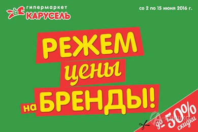 Со 2 по 15 июня 2016 г. в гипермаркете «Карусель» в Белгороде проходит акция «Режем цены на бренды!» – каждый день скидки по купонам до 50% на всю продукцию любимых марок!