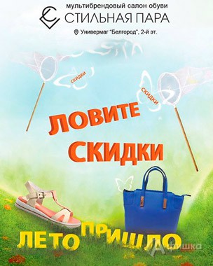 В мультибрендовом салоне обуви «Стильная пара» в Белгороде с 6 июня 2016 г. проходит акция «Лето пришло – ловите скидки» – действуют скидки от 20 до 50%!