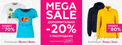 В магазине одежды «Finn Flare» в Белгороде Mega sale! С 6 июня 2016 г. действует дополнительная скидка 20% к распродаже! На выборочные модели скидки достигают 80%!
