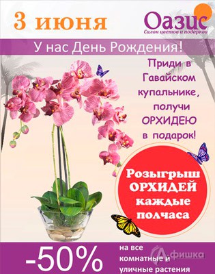 3 июня 2016 г. в честь Дня рождения салонов цветов и подарков «Оазис» будет действовать скидка 50% на все комнатные и уличные растения, скидка 30% на сувениры, скидка 20% на готовые букеты! Розыгрыш орхидей каждые полчаса!