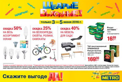 В «METRO Cash & Carry» в Белгороде каждую неделю проходит акция «Щедрые выходные»! Только с 3 по 5 июня 2016 г. скидка 25% на велосипеды, скейты, ролики и самокаты, скидка 40% на мебель для сада, скидка 50% на весь ассортимент лампочек Osram.