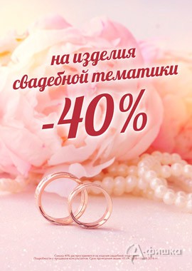 До конца августа 2016 г. в ювелирном магазине «Кристалл» в Белгороде действует специальное предложение для молодоженов «Свадебный сезон» – низкая цена за грамм золота 585 пробы (2150 руб.) и скидка 40% на обручальные кольца!