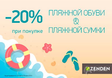 В обувных магазинах «Zenden» до 30 июля 2016 г. проходит акция – при покупке пляжной обуви и пляжной сумки действует скидка 20%!