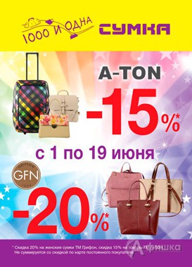 С 1 по 19 июня 2016 г. в магазине «1000 и одна сумка» в Белгороде действует скидка 20% на женские сумки ТМ «Гриффон» и скидка 15% на товары ТМ «А-Тон».