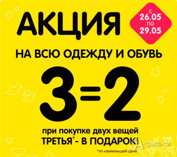 В магазинах «Детский мир» с 26 по 29 мая 2016 г. на всю одежду и обвуь проходит акция «3=2»! При покупке двух вещей, третья – в подарок!