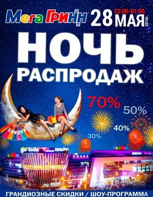 28 мая 2016 г. с 22:00 до 01:00 в ТРЦ «Мега ГРИНН» в Белгороде пройдёт Ночь распродаж – грандиозные скидки до 70%, шоу-программа, конкурсы и подарки!