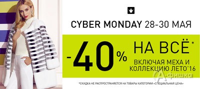 Только 3 дня, с 28 по 30 мая 2016 г. в магазине «Снежная Королева» в Белгороде масштабная распродажа «Киберпонедельник»! Действует скидка 40% на весь ассортимент, включая меха!