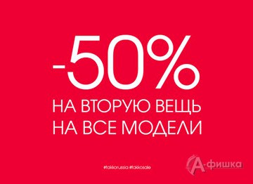 В магазине одежды «Takko Fashion» в Белгороде с 27 мая по 5 июня 2016 г. действует предложение – скидка 50% на вторую вещь с наименьшей ценой в чеке! Акция действует на все модели.