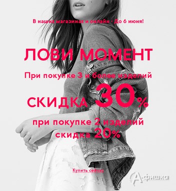 Лови момент в магазине модной женской одежды «Mango» в Белгороде! До 6 июня 2016 г. при покупке 3 и более изделий скидка 30%; при покупке 2 изделий скидка 20%!