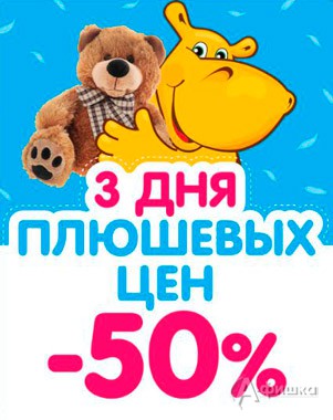 С 30 мая по 1 июня 2016 г. в гипермаркетах игрушек «Бегемот» проходит акция «Три дня плюшевых цен»: на все мягкие игрушки скидка 50%!