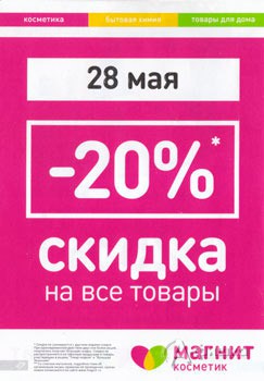 Только 1 день, 28 мая 2016 г. в сети магазинов «Магнит Косметик» будет действовать скидка 20% на все товары!
