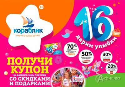 С 25 мая по 7 июня 2016 г. в детских магазинах «Кораблик» проходит акция «Дарим улыбки 16 лет!» – за каждую 1000 руб. покупки получите купон со скидками до 70% и подарками!