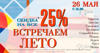 В сети магазинов обуви и аксессуаров «Helmar» и «Rieker» в Белгороде 26 мая 2016 г. пройдет акция «Встречаем лето» – с 15:00 и до закрытия магазинов будет действовать скидка 25% на весь ассортимент!