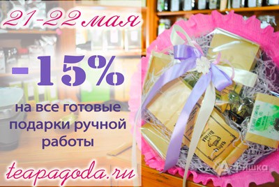 В сети магазинов «Чайная Пагода» в Белгороде 21 и 22 мая 2016 г. проходят «Дни готового подарка»! На все подарки ручной работы из чая и кофе скидка 15%!