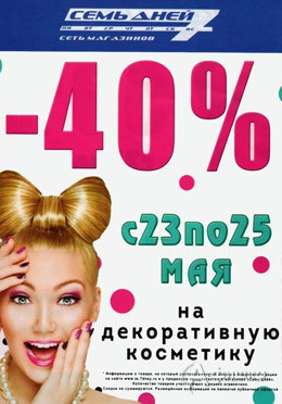 С 23 по 25 мая 2016 г. в сети магазинов парфюмерии, косметики и бытовой химии «7 дней» в Белгороде действует скидка 40% на декоративную косметику; скидка 50% на аксессуары для волос; скидка 30% на краску для волос и стайлинг!