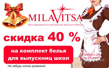 В фирменных магазинах белья «Milavitsa» в Белгороде только с 24 по 29 мая 2016 г. на комплект белья для выпускниц школ действует скидка 40%!