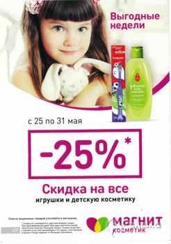 В сети магазинов «Магнит Косметик» проходит акция «Выгодные недели». С 25 по 31 мая 2016 г. скидка 25% на все игрушки и детскую косметику!