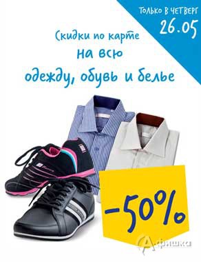 Только 26 мая 2016 г. в гипермаркетах «Лента» в Белгороде пройдёт акция – скидка 50% на всю одежду, обувь и бельё по карте «Лента»!