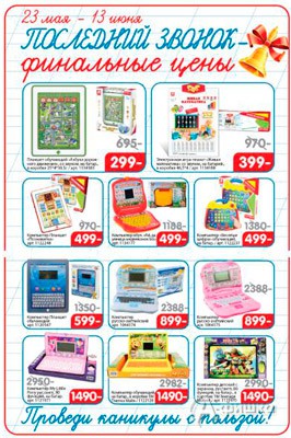 С 23 мая по 13 июня 2016 г. в гипермаркетах игрушек «Бегемот» проходит акция «Последний звонок – финальные цены»: значительно снижены цены на выделенный ассортимент обучающих игрушек!