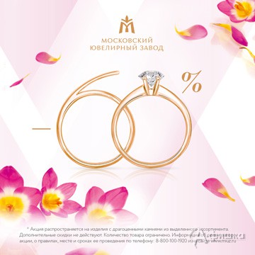 С 22 марта по 22 апреля 2016 г. в магазинах «Московского ювелирного завода» проходит акция – при покупке изделий из золота или платины со вставками из драгоценных камней из выделенного ассортимента предоставляется скидка 60%!