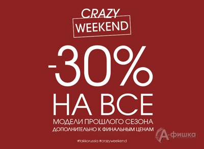 В магазине одежды «Takko Fashion» в Белгороде проходит Crazy weekend – с 23 по 27 марта 2016 г. на все модели прошлого сезона дополнительная скидка 30%!