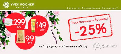 Только до 27 марта 2016 г. в бутиках косметики «Ив Роше» проходит акция «Цены 2014 года на бестселлеры марки» – эксклюзивно в бутиках скидка 25% на один продукт по Вашему выбору по кодовому слову «Невероятные цены»!