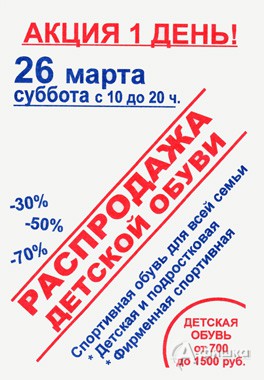 Только 1 день, 26 марта 2016 г. с 10:00 до 20:00 в ТЦ «Меркурий» пройдет распродажа детской и подростковой обуви, а также спортивной обуви для всей семьи – скидки до 70%!
