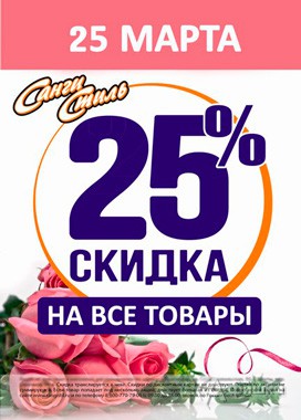 25 марта 2016 г. в сети магазинов косметики и бытовой химии «Санги Стиль» снова бум скидок! Действует скидка 25% на все товары!