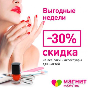 В сети магазинов «Магнит Косметик» проходит акция «Выгодные недели» – до 29 февраля 2016 г. скидка 30% на все лаки и аксессуары для ногтей!