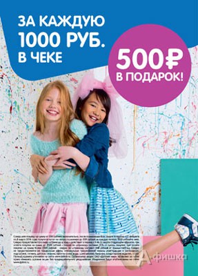 В магазинах «Детский мир» с 23 февраля по 8 марта 2016 г. проходит акция – при единовременной покупке за каждую 1000 руб. в чеке 500 руб. на следующую покупку в подарок!