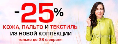 В магазине одежды и аксессуаров «Алеф» в Белгороде с 26 по 28 февраля 2016 г. предоставляется скидка 25% на изделия из кожи и текстиля, пальто из новой коллекции!