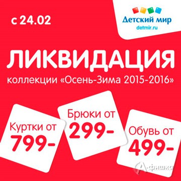 В магазинах «Детский мир» с 24 февраля проходит ликвидация коллекции одежды и обуви «Осень-Зима 2015-2016»!